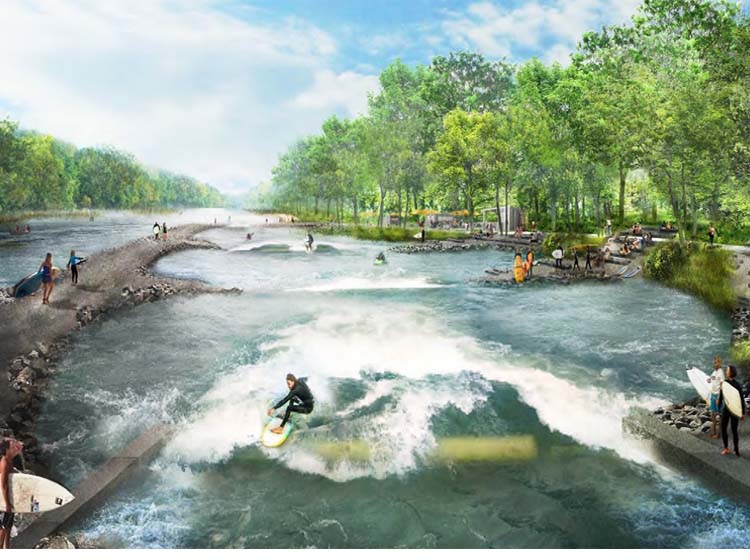The Watercourse takes advantage of the site’s existing hydrology and the large volume of water stored in Cayuga Lake, employing the existing tainter gate dam structure to regulate water flows, as appropriate, for new in-water activities.